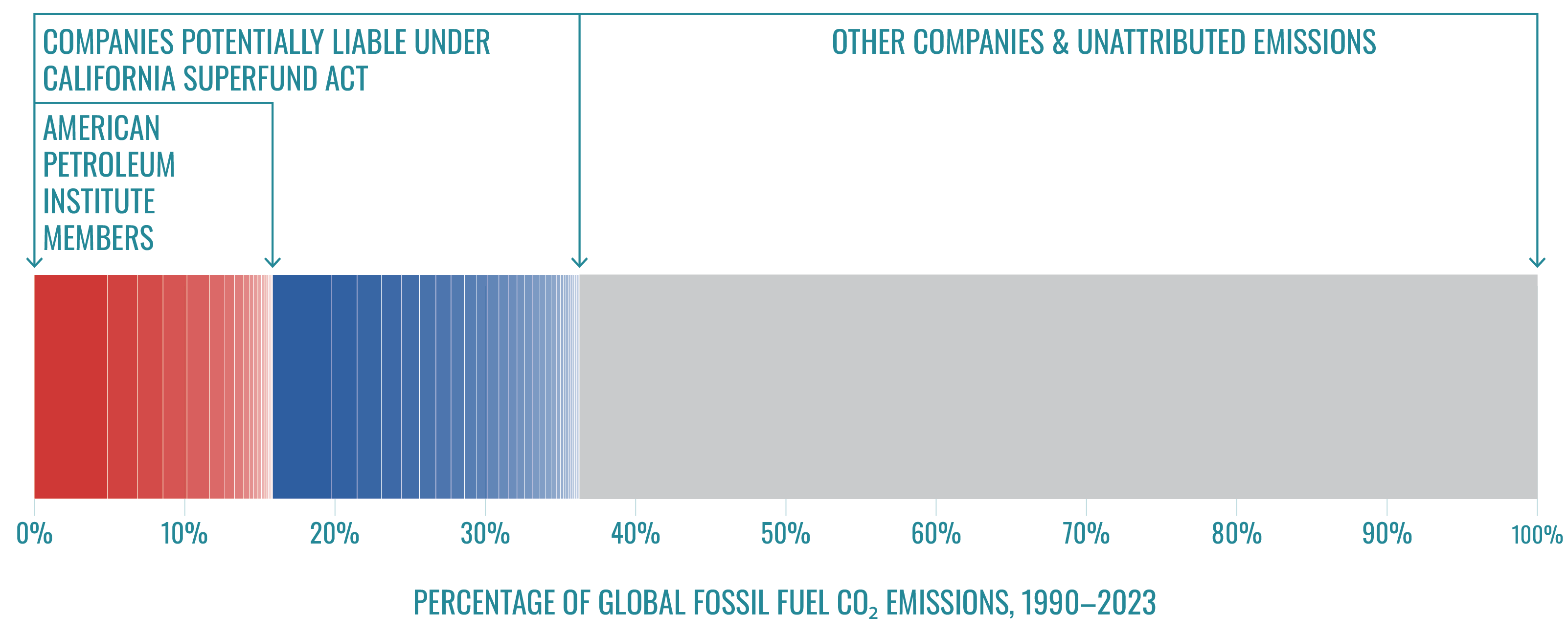 At least 47 extractive fossil fuel producers may be liable under California’s proposed Climate Superfund Act, as identified in the Carbon Majors database maintained by InfluenceMap3. Based solely on their quantified emissions in Carbon Majors, these 47 companies are linked to 36.4% of global fossil fuel CO2 emissions from 1990–2023 (data for 2024 is not yet available). They would therefore potentially be liable for 36.4% of the bill’s recovery target. At least 18 of these 47 companies are members of API, together responsible for 15.9% of global fossil fuel C02 emissions over this period and thus potentially liable for 15.9% of the bill's damage recovery target, or approximately $65 billion in recovered costs.4